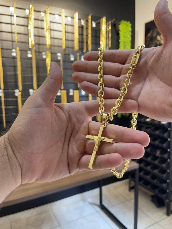 CORRENTE CADEADO QUINADA 8MM + PINGENTE CRUZ FORRADA